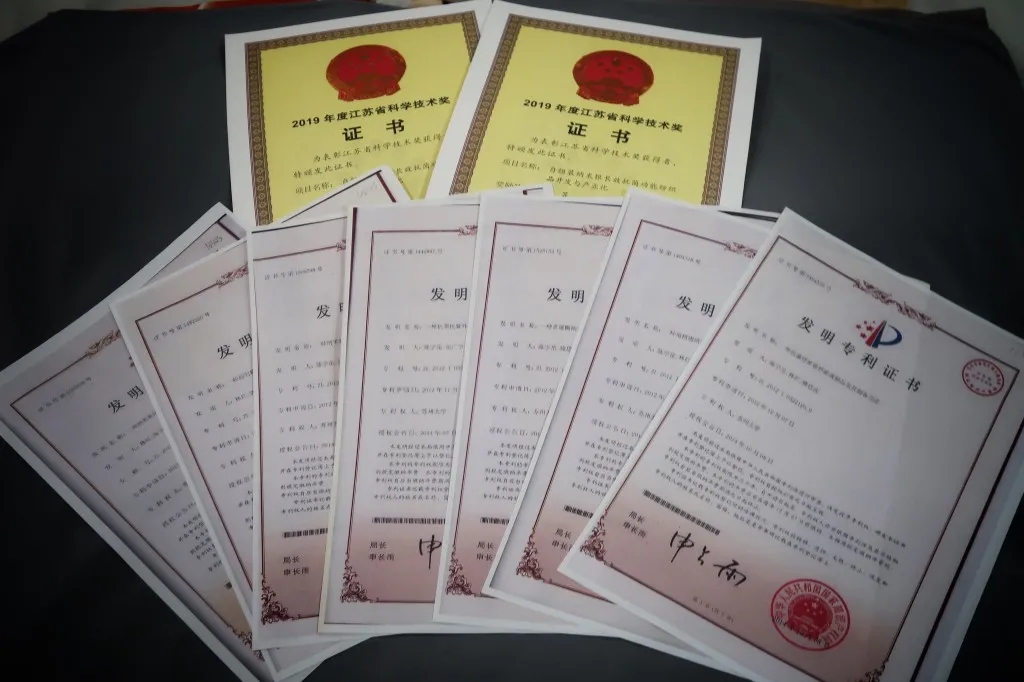 陈宇岳教授团队所获得的江苏科学技术奖证书及发明专利证书。 据了解,陈宇岳科研团队有多年从事抗菌纺织品的研究历史,在纳米材料研究领域已取得了二十多项发明专利授权,并分别获2012年国家重大科学研究计划(863计划)和国家自然科学基金项目的支持,成果在医用材料领域已获得多年应用,相关成果分别在2013年荣获中国纺织工业联合会科技进步一等奖、2019年江苏省科技进步三等奖。今年上半年,其相关技术又获得了国家先进功能纤维创新中心的项目支持。 |